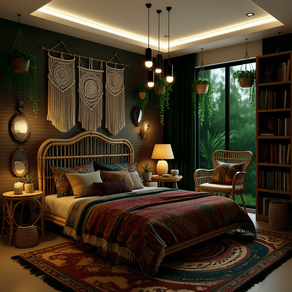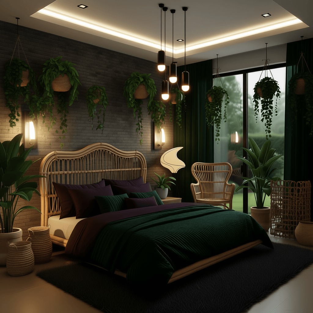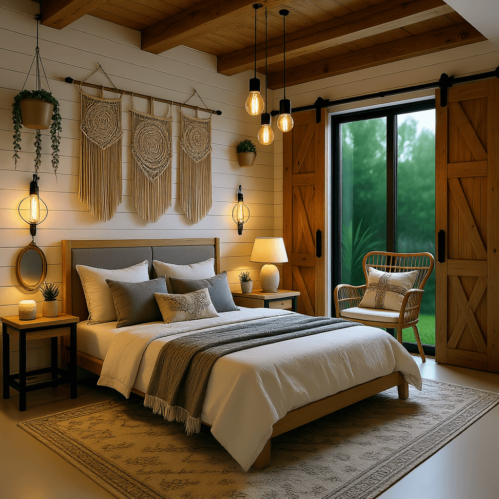 A bohemian bedroom is all about creativity and free-spirited design. Layer rugs, mix patterns, and add woven textures like macramé wall hangings or rattan furniture. Don’t be afraid to play with vibrant colors and eclectic accessories. Plants are also a big part of boho décor, adding a natural and lively feel. This style is perfect if you want your bedroom to feel artistic, laid-back, and full of personality. The bohemian vibe brings warmth and makes your space feel welcoming and adventurous.
