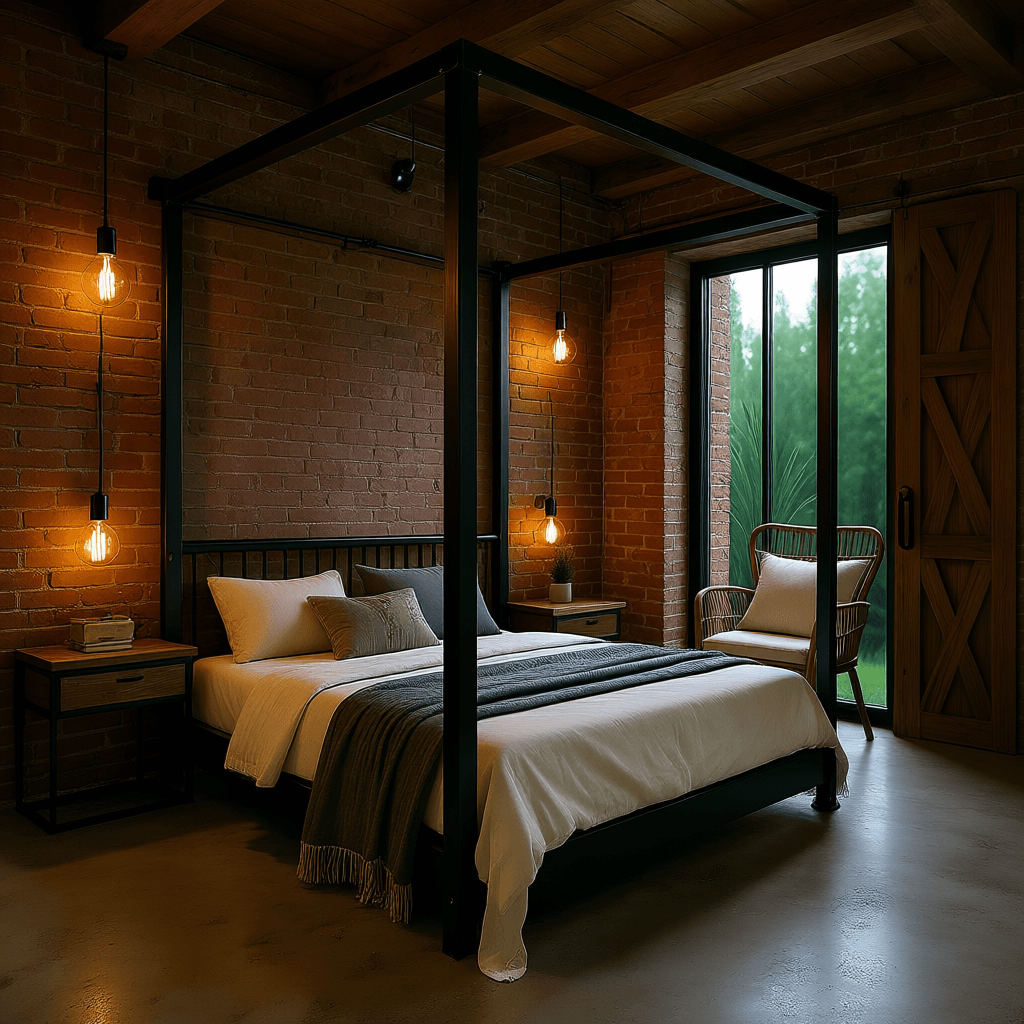 An industrial bedroom design is inspired by urban lofts and warehouse spaces. Exposed brick walls, raw wood, and metal bed frames are key elements. Edison bulbs or black metal accents add to the rugged charm. Despite its rough materials, this style can be made cozy with soft linens and layered textures. Industrial bedrooms are perfect for anyone who loves modern, edgy, and bold design. They strike a balance between minimalism and personality.